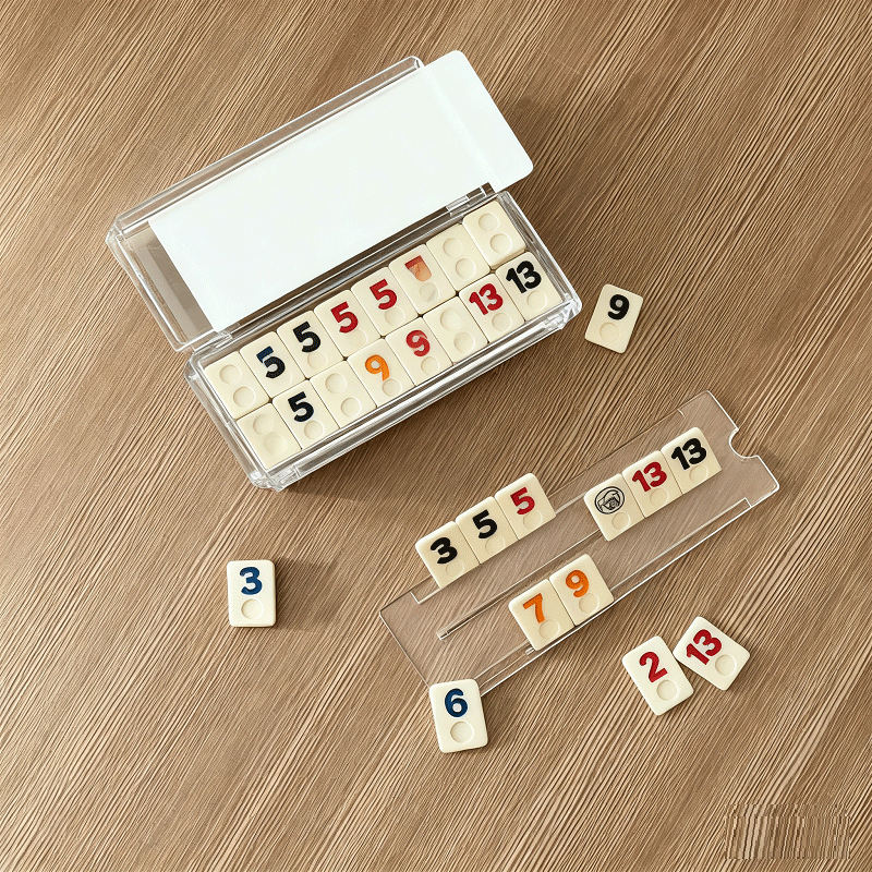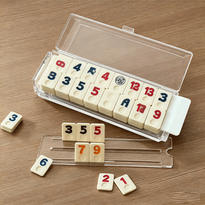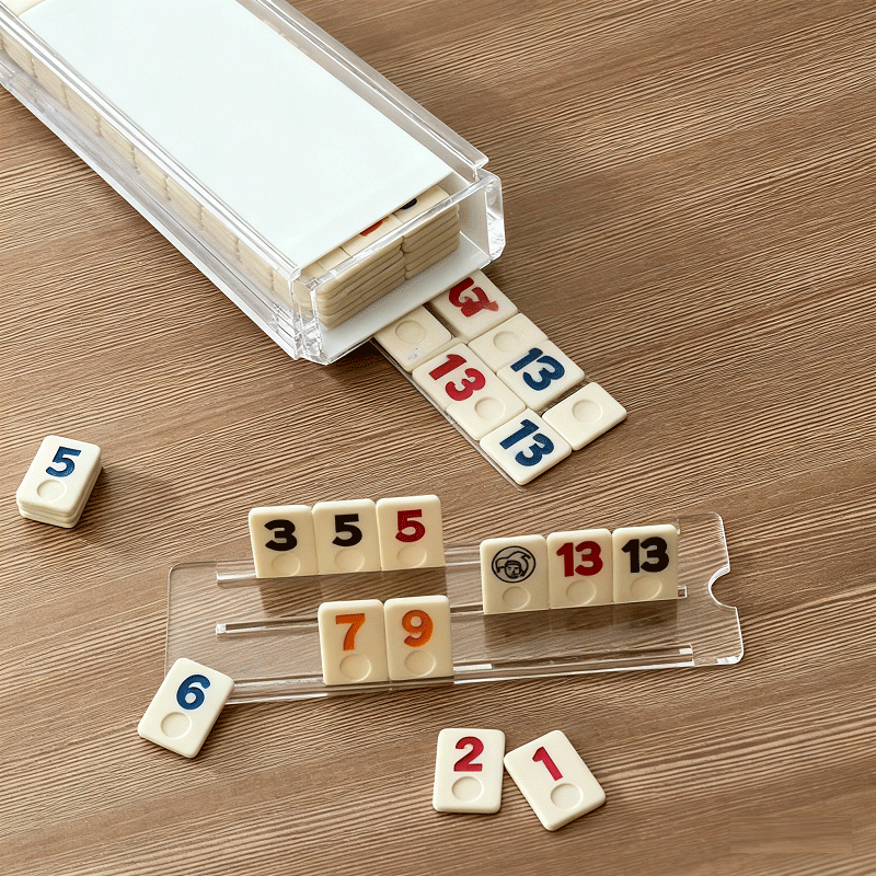 The Acrylic Rummikub Board Game Set is an acrylic-made Rummikub board game set that combines durability and visual texture, allowing multiple players to enjoy this strategic game by matching numbers and colors.
