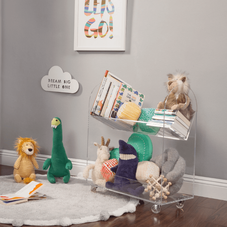 Sleek, stylish, and portable,The perfect spot for storing favorite books, plush toys, and other accessories, this portable bookcase is crafted from 100% clear recyclable acrylic lucite for a modern touch.