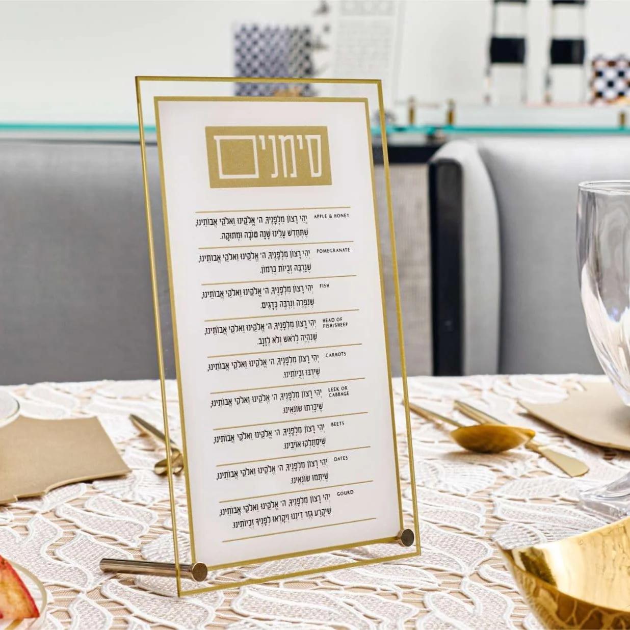 The customizable Classic Basic Simanim tabletop is a sophisticated and practical choice for your Rosh Hashanah table! Customizable in size and detail, it can be placed next to individual guest seats or used as a centerpiece. Wipe-cleanable and honey- and water-resistant, it offers both exclusivity and durability, adding a touch of sophistication to any festive table.